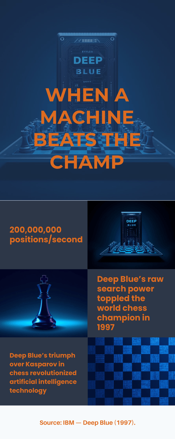 In May 1997, IBM’s Deep Blue defeated Garry Kasparov, the reigning world chess champion, in a six‑game match. Deep Blue did not “think” like a person. It evaluated around 200 million positions per second and used carefully crafted search algorithms with expert‑encoded evaluation functions. The result was historic and widely reported by outlets like The New York Times (1997) and summarized clearly by Britannica and IBM Research’s Deep Blue page.