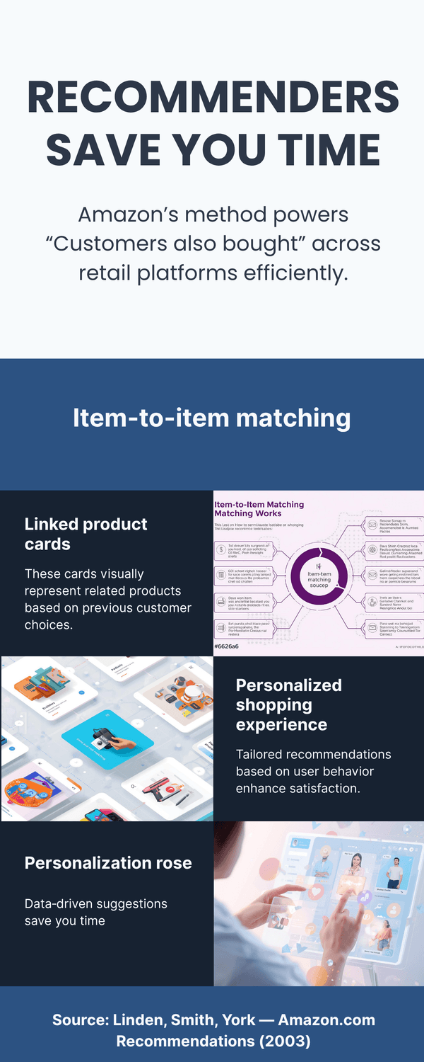 In the early 2000s, recommendation systems moved from research labs into everyday products. Retailers and media platforms began using your clicks, ratings, and purchases to predict what you would likely want next. A key milestone was Amazon’s item‑to‑item collaborative filtering, which compared products rather than people to deliver fast, scalable suggestions.