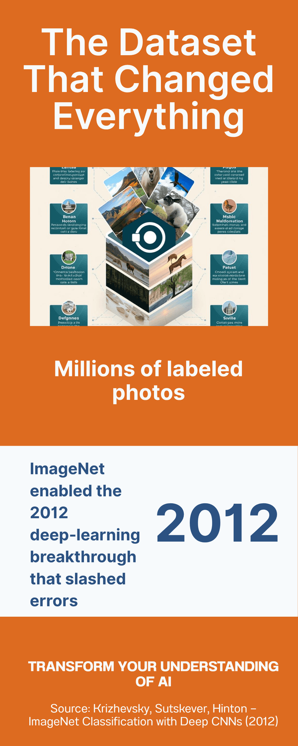 You might be wondering, why did accuracy jump so quickly? Three ingredients came together. First, data: ImageNet offered a massive, well‑labeled dataset covering thousands of object categories. Second, compute: affordable GPUs let networks train in days instead of months. Third, architecture and tricks: convolutional layers, ReLUs, dropout, and data augmentation improved learning and reduced overfitting. None of these alone were brand‑new, but together they crossed a threshold.